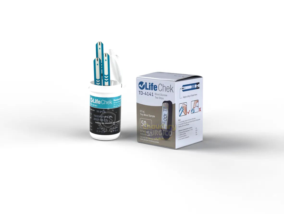 This product contains LifeChek TD-4141 Blood Glucose Test Strips, which are designed for the determination of blood glucose levels. These strips require only a tiny 0.5 µL blood sample, making the testing process less invasive. They are specifically calibrated for use with the LifeChek TD-4141 Blood Glucose Monitoring System. The packaging shows a quantity of 50 strips, supplied in a single vial. The strips offer fast and accurate results to aid in diabetes management.